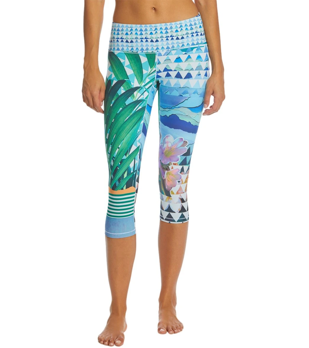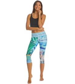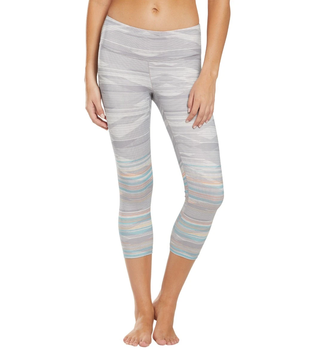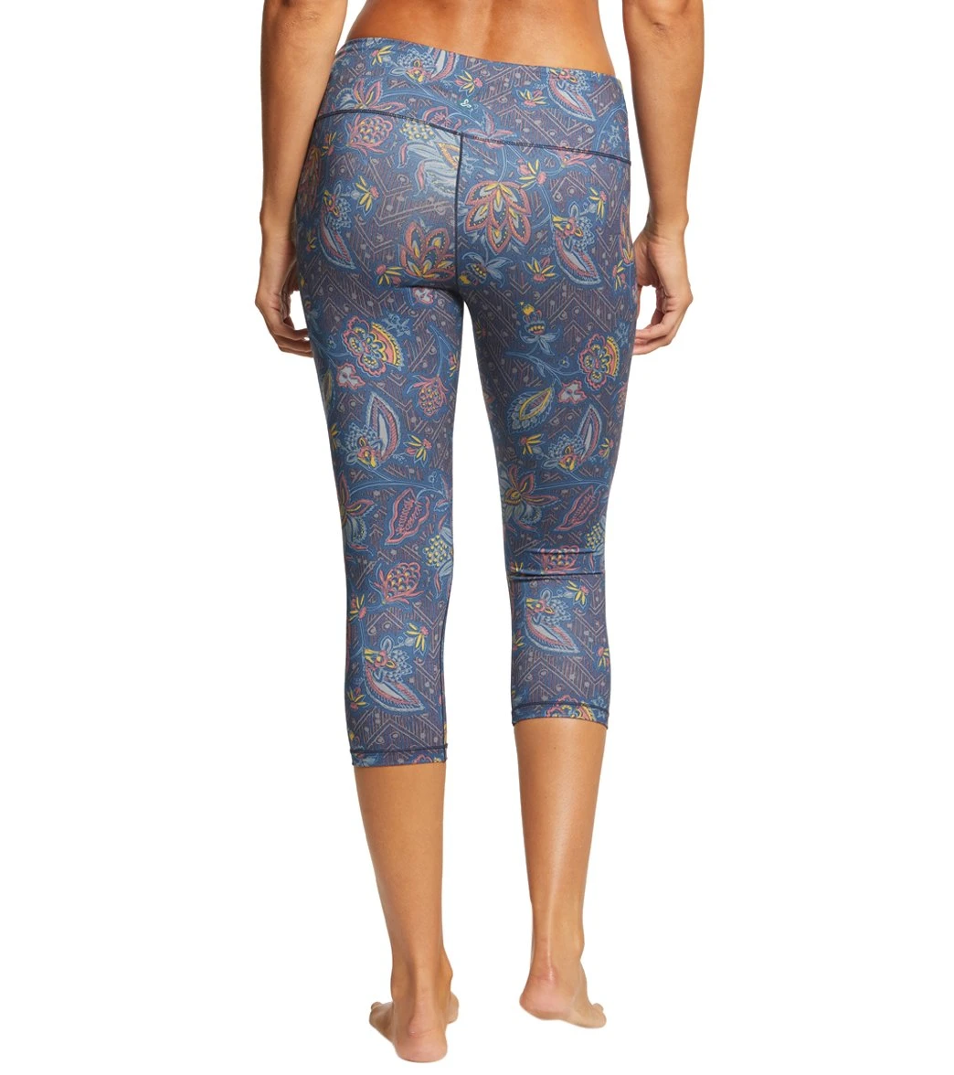 Step into these Prana Pillar Printed Yoga Capris for a comfortable practice. Made with recycled polyester fabric, these performance capris include moisture-wicking technology to keep you cool as you sweat. Its wide, mid-rise waistband hugs your lower stomach, while the triangle gusset adds comfort and reinforcement.Â
